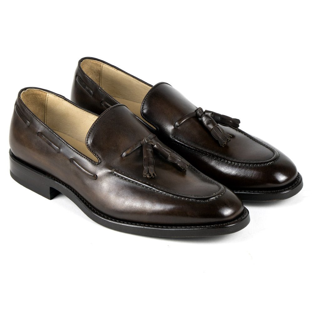 The Espresso colour loafers are made of hand-coloured leather and leather sole in Goodyear Flex construction. A visible stitching, a particular decoration on the sides and the tassel on the upper complete a classic and elegant style.