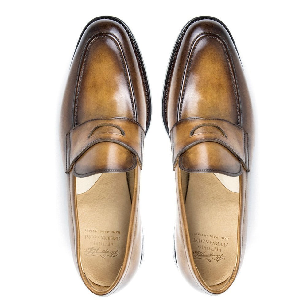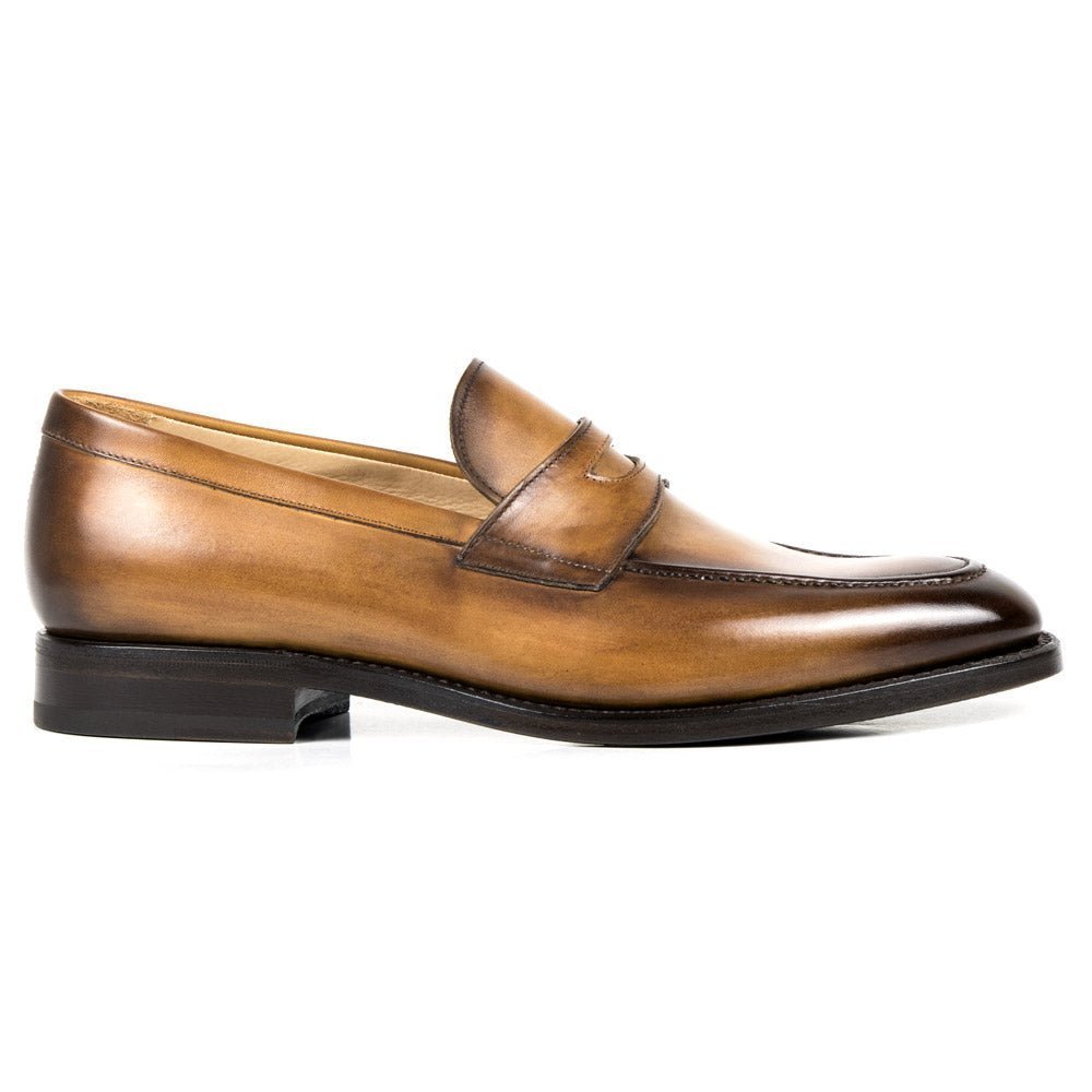 Amber-colored antiqued leather moccasin with a leather sole, made using Goodyear Flex construction technique. The hand-stitched seams on the last give it a classic and elegant style.