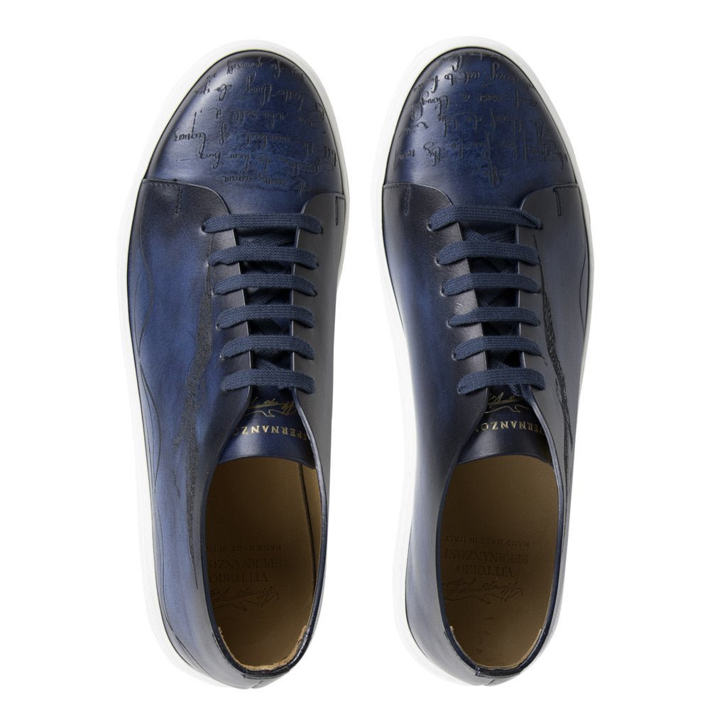 Sneaker in oceano calfskin leather, engraved and entirely handmade antiqued. Rubber sole and AGO construction. The sporty design and refined makes this versatile sneaker ideal for casual wear. Made in Italy.