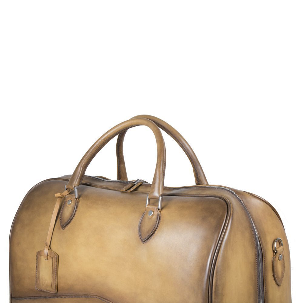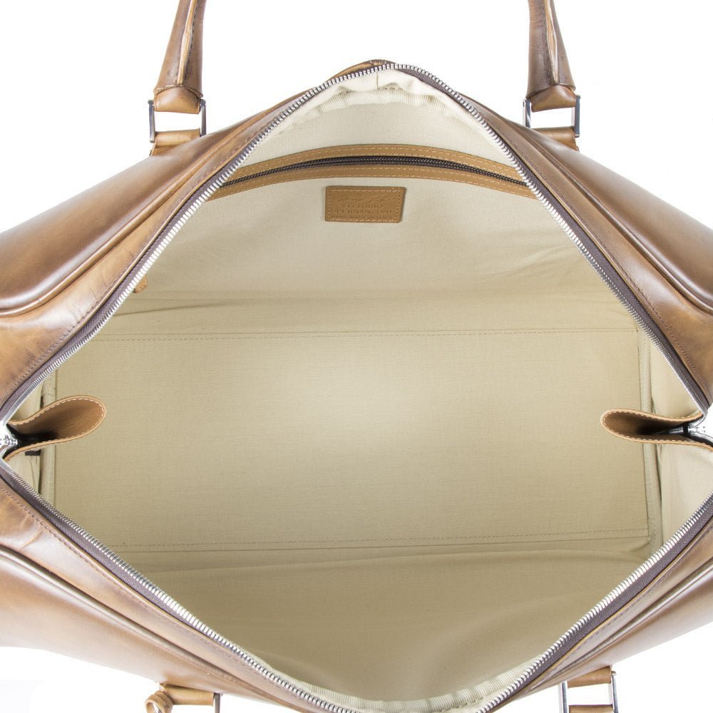 Comoda e pratica borsa da viaggio realizzata in pregiata pelle di vitello, anticato e lucidato sui toni dell'ambra. Chiusura a zip, con robusti manici in pelle e tracolla regolabile. Dimensioni L: 55 cm H: 34 cm W:26 cm
