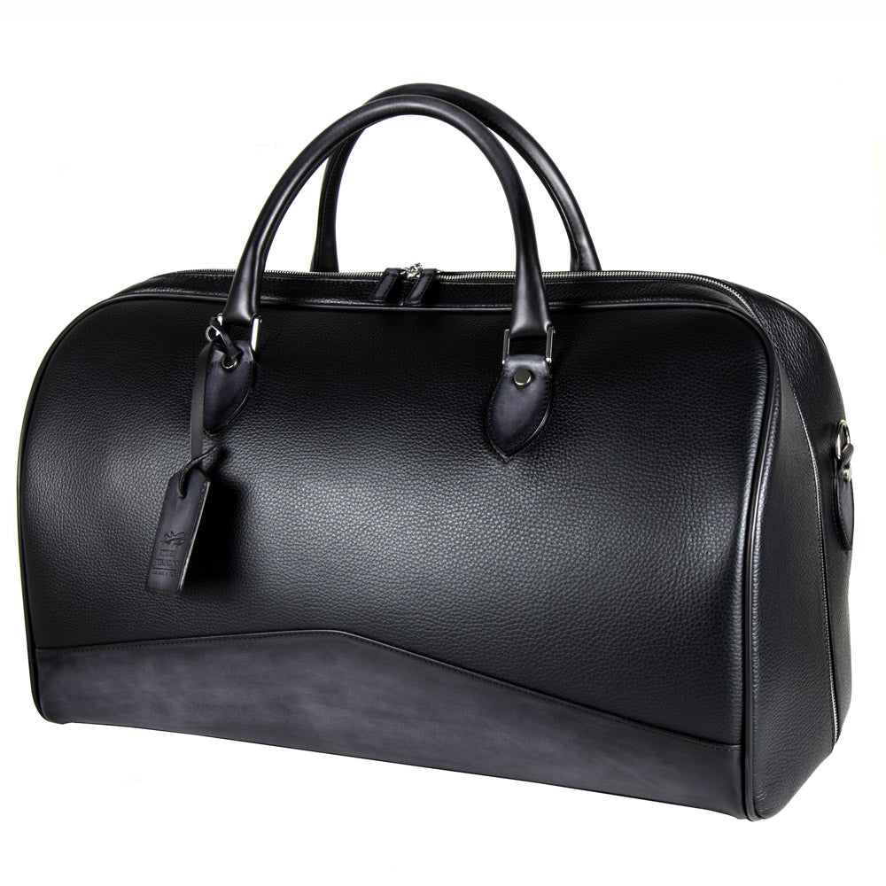 Comoda e pratica borsa da viaggio realizzata in pregiata pelle martellata nera e con pelle di vitello decolorato e lucidato sui toni del nero. Chiusura a zip, con robusti manici in pelle e tracolla regolabile. Dimensioni L: 55 cm H: 34 cm W: 26 cm