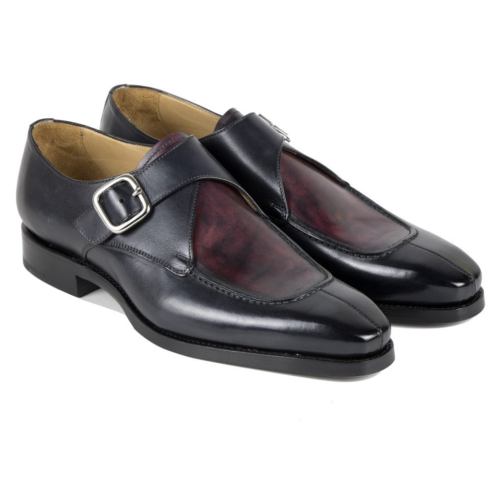 Mono fibbia in morbida pelle in due colori rosso e nero, anticata a mano e cuciture in punta. Suola in cuoio applicata con tecnica Goodyear Welted che la rende unica nel comfort.