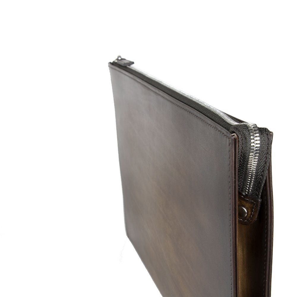 Pouch portatablet in morbida pelle di vitello di colore espresso interamente anticata a mano. Chiusura laterale con zip su due lati e tirazip in pelle. Interno con fodera in tessuto, tasche porta oggetti ed inserto in pelle con logo Spernanzoni.