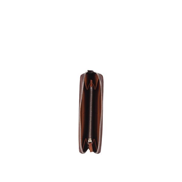 Portafoglio verticale con chiusura zip, realizzato in pelle di vitello anticata e lucidata a mano sulle tonalità dell'ambra. Interno tono su tono è organizzato in 8 slot portatessere, due ampi scomparti a soffietto, due tasche piatte e una tasca con zip.