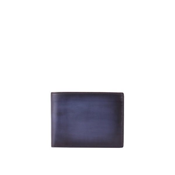 Portafoglio realizzato in pelle di vitello anticata e lucidata a mano sulle tonalità oceano.
