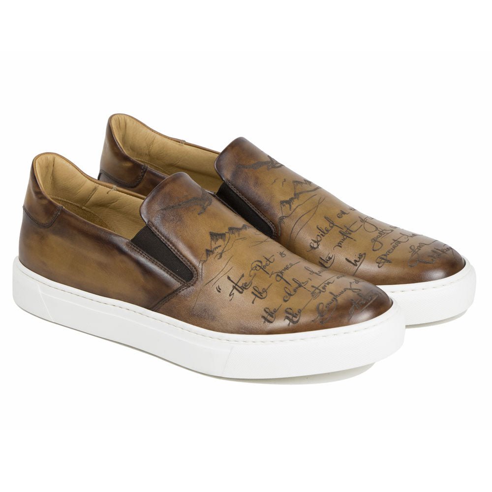 Slip-on realizzata in morbida pelle di vitello di colore ambra incisa, interamente anticata a mano. Suola in gomma leggerissima e lavorazione artigianale AGO. Il design sportivo e raffinato rende questa sneaker versatile, comoda e pratica, ideale per un abbigliamento casual.