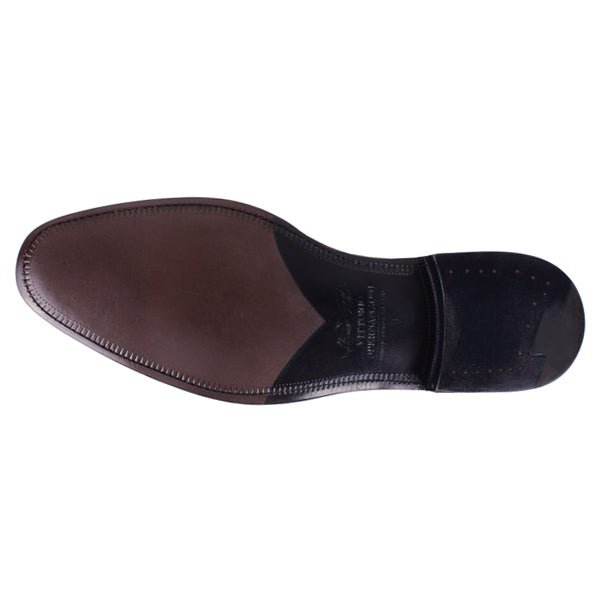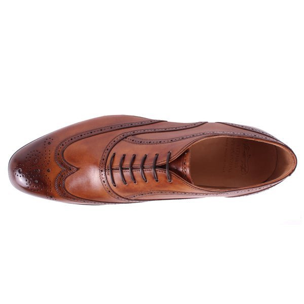 Scarpa Stringata 6 fori in pelle anticata e lucidata a mano color Ambra Antique. Il design viene reso classico tramite le lavorazioni a fiori in punta e sulla tomaia. La suola in cuoio realizzato con lavorazione Goodyear.