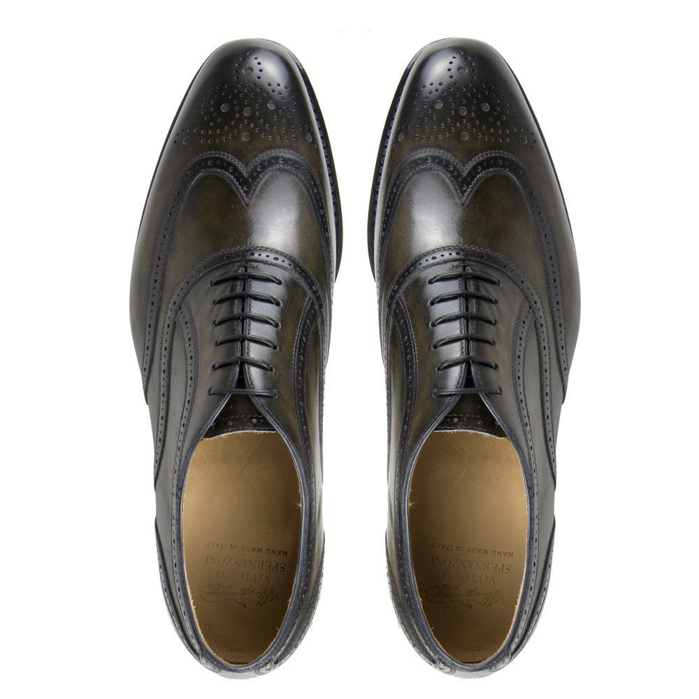 Scarpa Stringata 6 fori in pelle anticata e lucidata a mano color Antique Ortica. Il design viene reso classico tramite le lavorazioni a fiori in punta e sulla tomaia. Suola in cuoio applicata con tecnica Goodyear Welted che la rende unica nel comfort.
