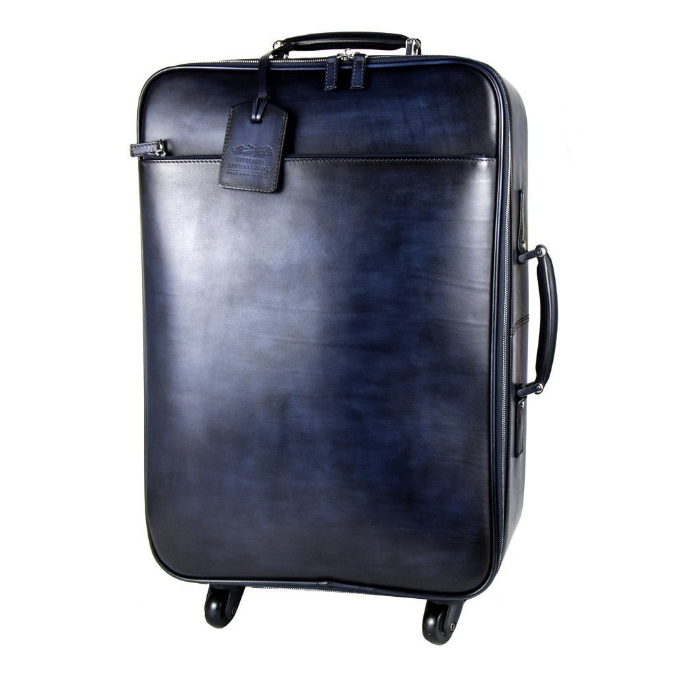 Trolley comodo e pratico per viaggiare con stile. Le sue linee morbide ed eleganti lo rendono un accessorio ideale per i viaggiatori più esigenti. Con quattro ruote multidirezionali, due comodi manici in pelle e manico telescopico ergonomico a 3 lunghezze. Tasca frontale e chiusure con doppie zip bidirezionali. Realizzato con pelle pregiatissima di vitello anticata a mano sui toni del blu oceano. Dimensioni L: 38 cm H: 60 cm W: 20 cm